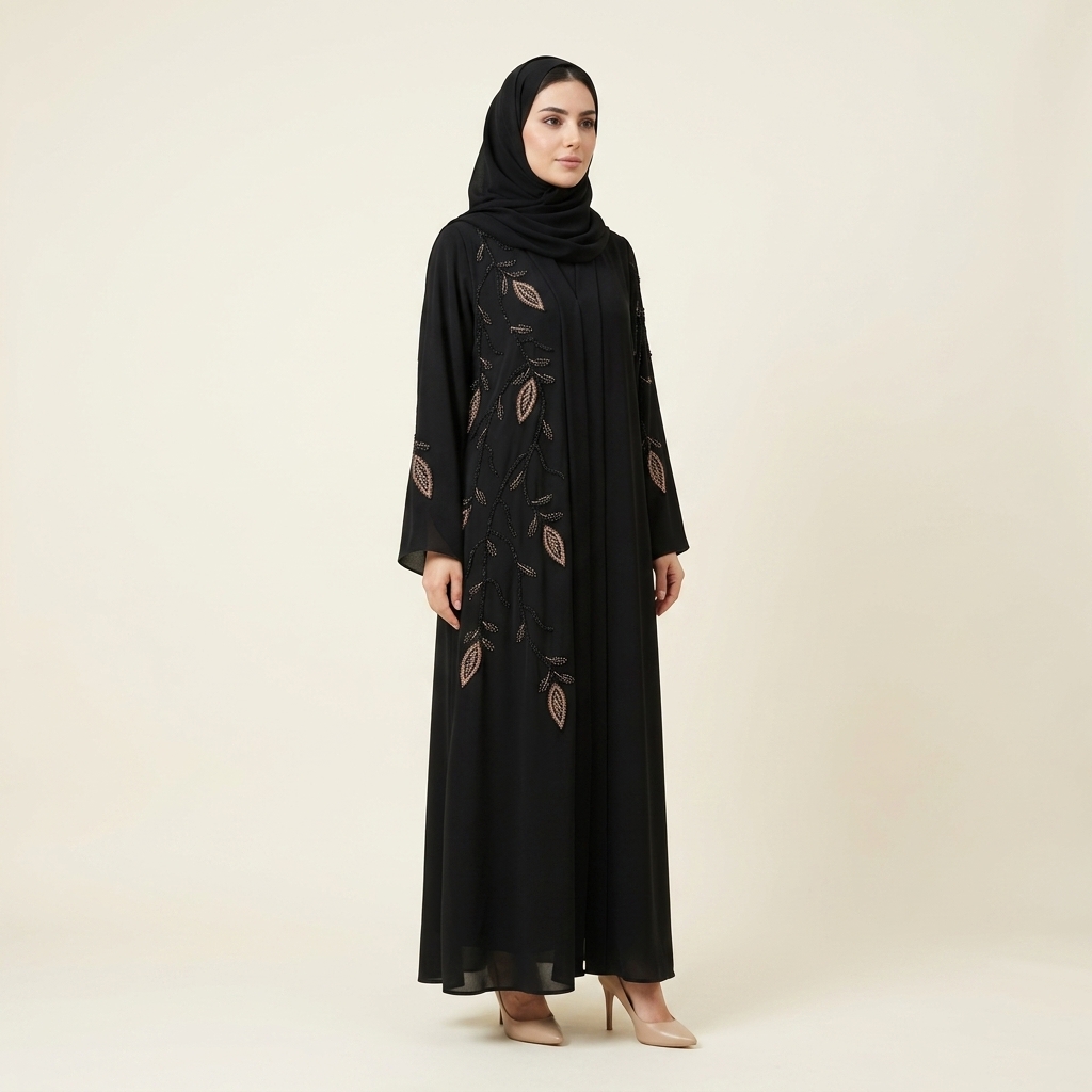 Black flowy Abaya with detailed refined handwork to elevant your everyday or ocassional events.