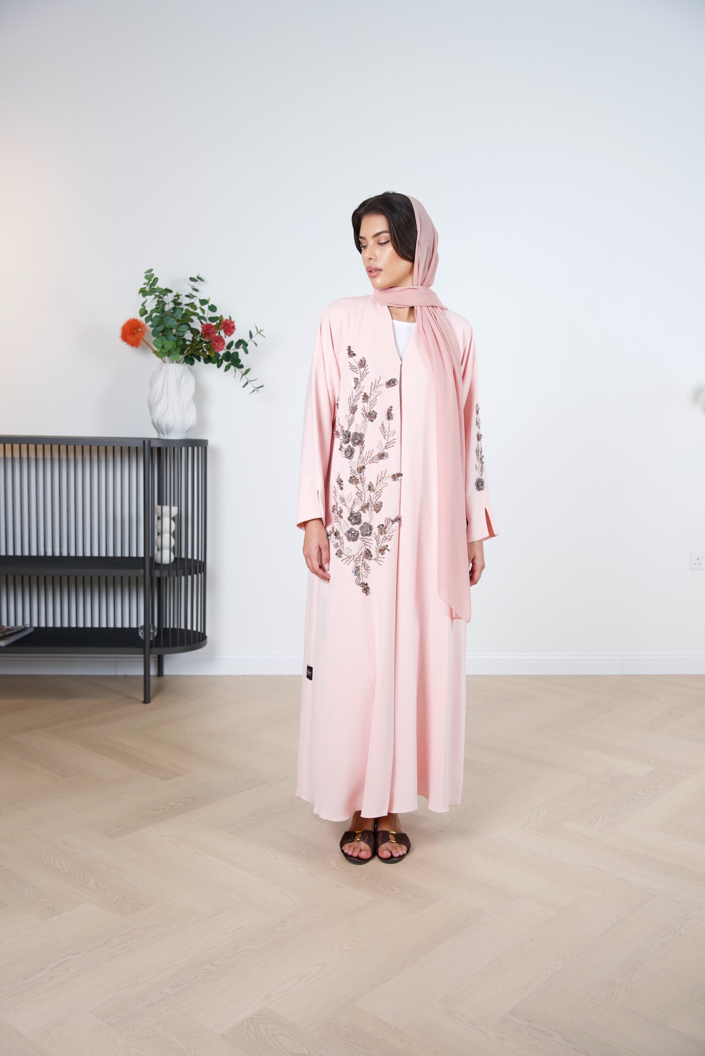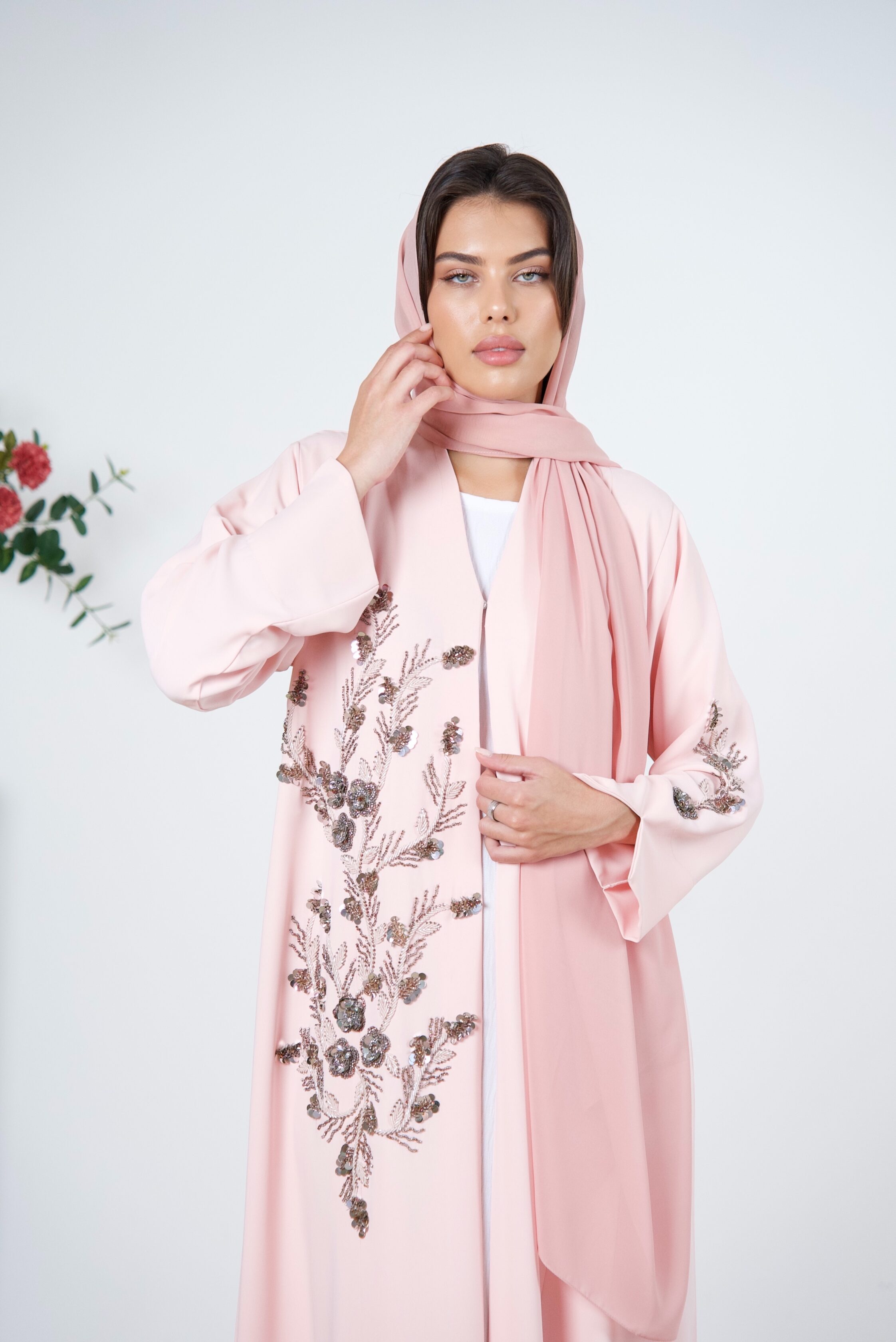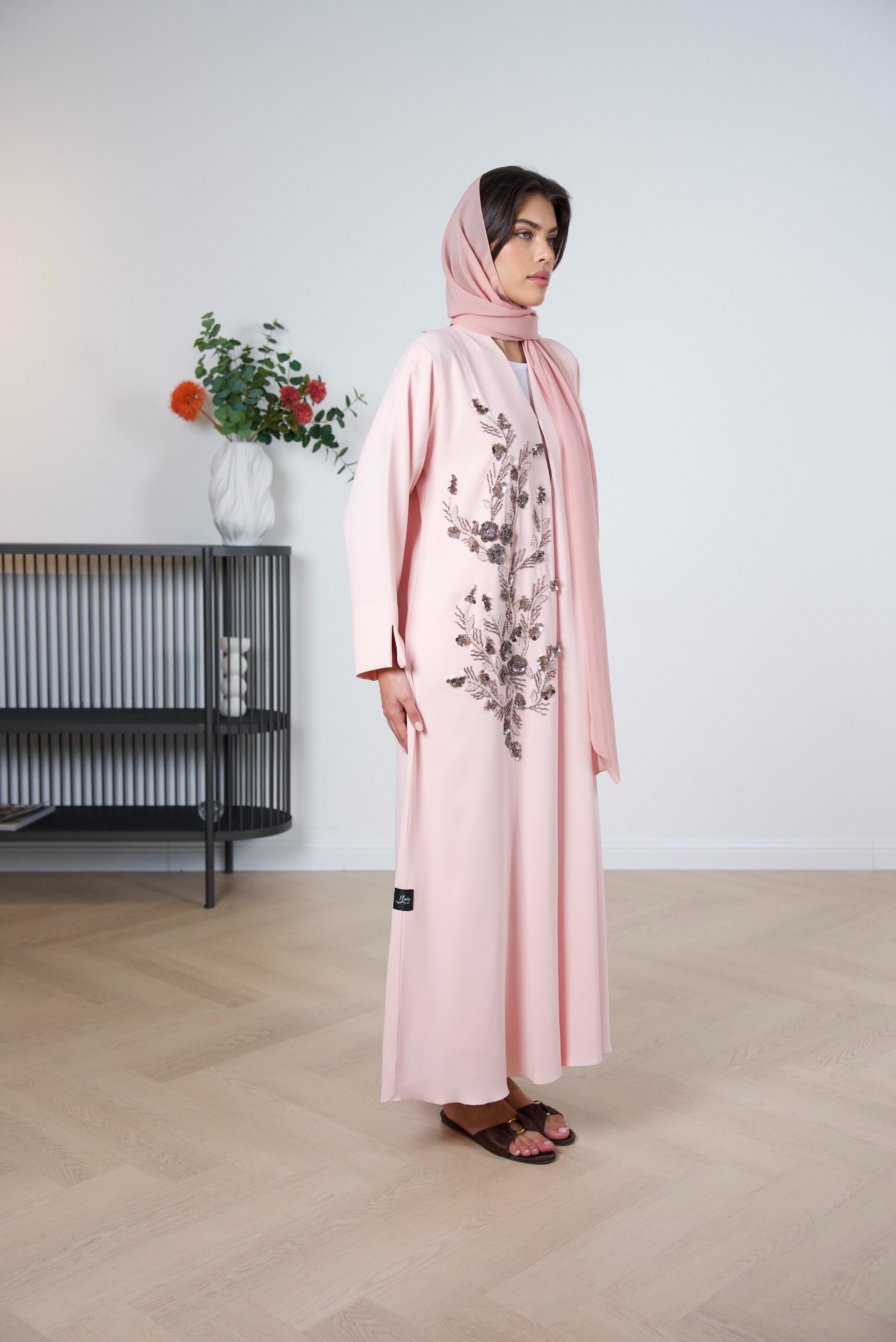 Our Blush Grace Abaya is a delicate and feminine piece in a soft baby pink hue. Featuring intricate handwork on one side in a soft comfortable crepe fabric. Abaya + Matching Chiffon Shaila.