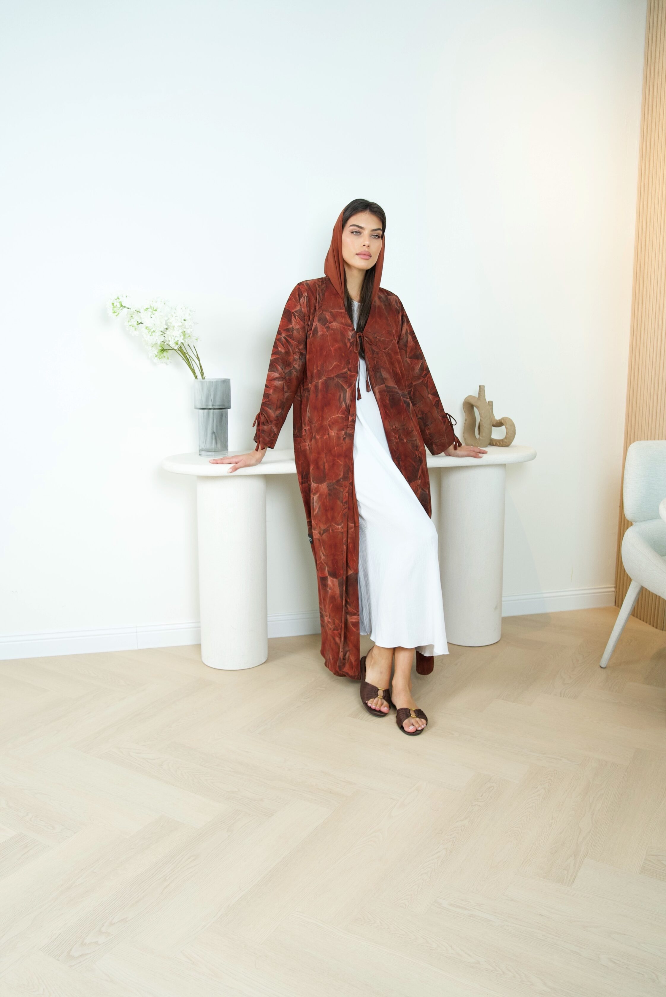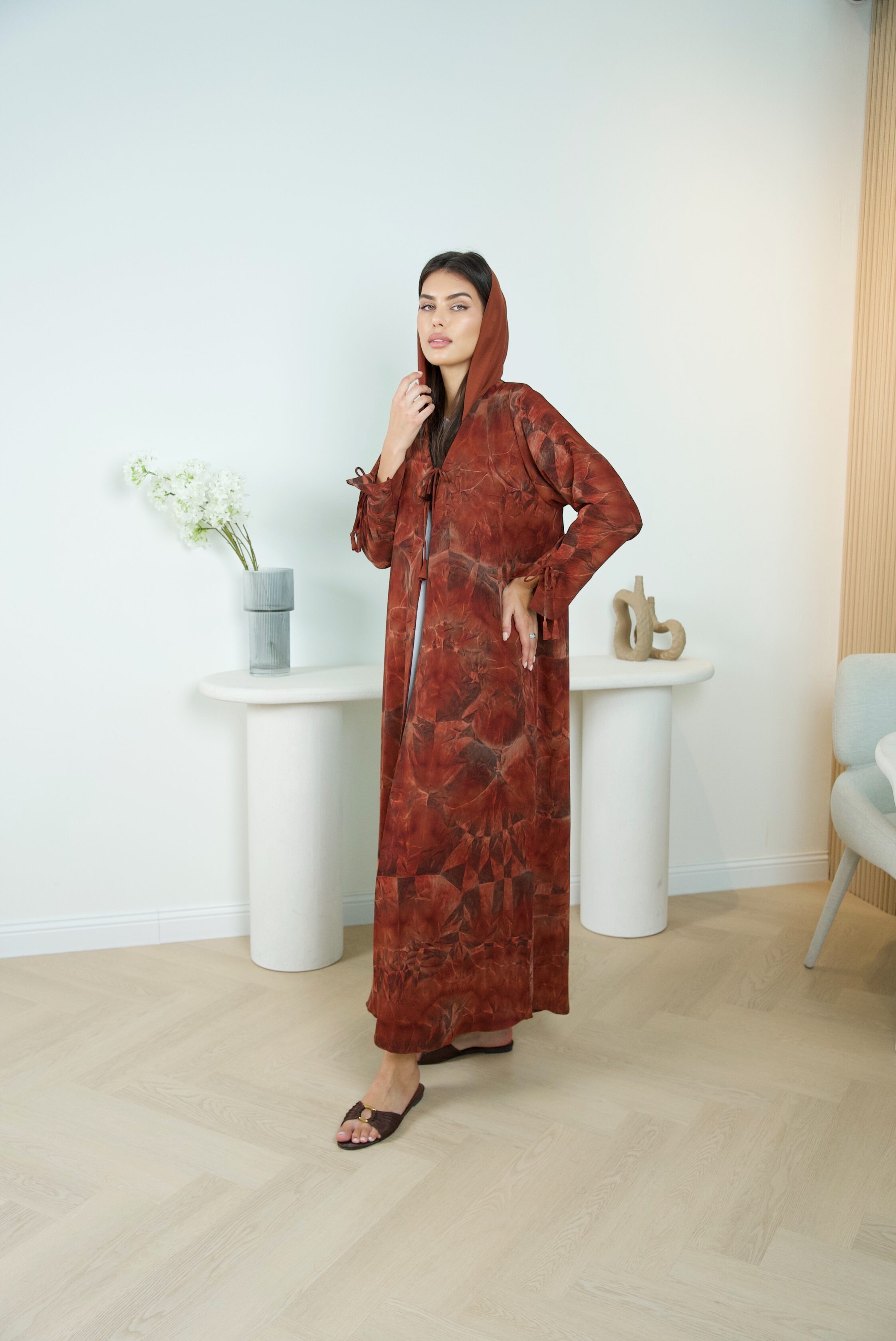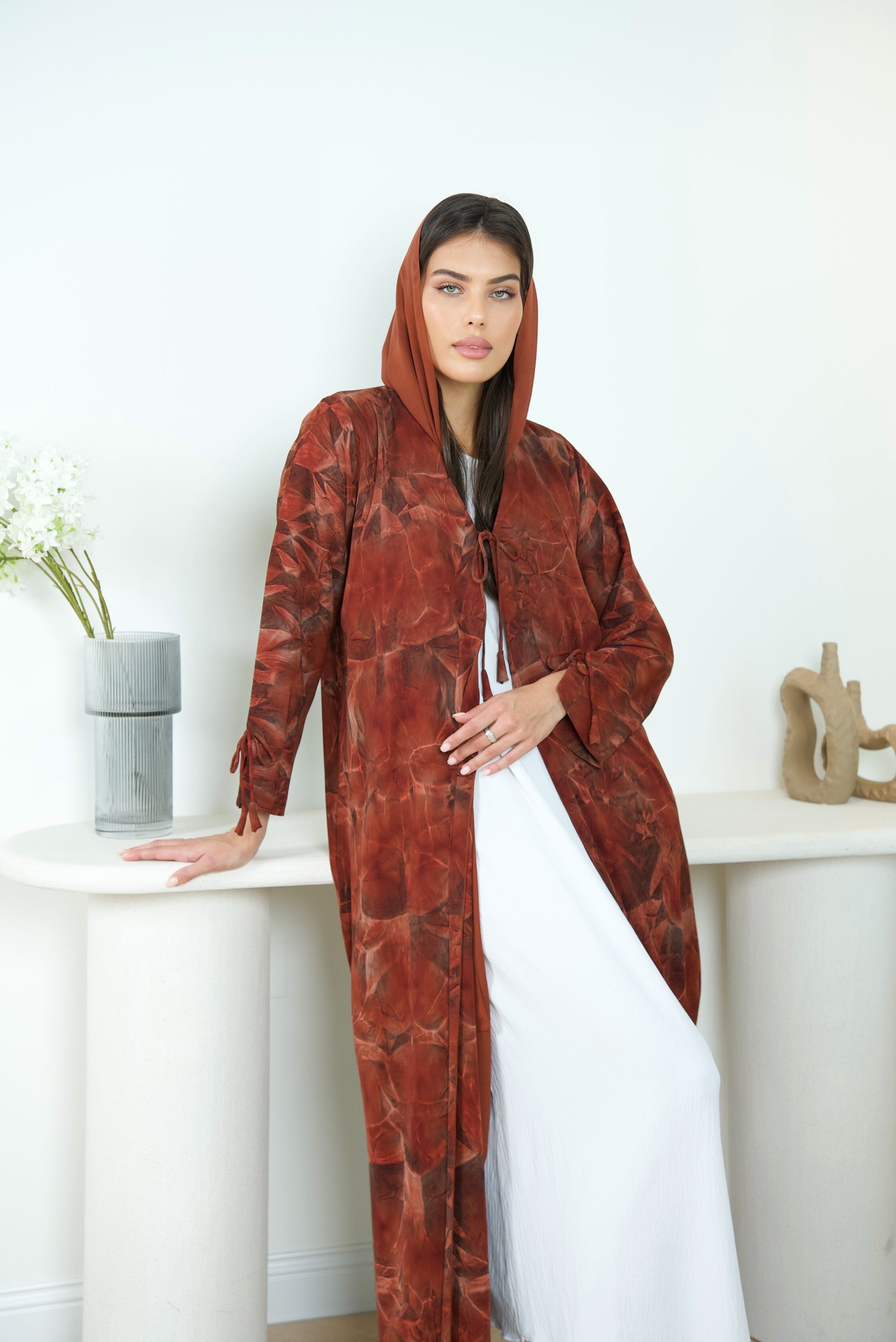 The Burnt Orange Abaya is a vibrant and elegant addition to any wardrobe. Crafted from lightweight, flowy fabric, it features an all-over print in warm burnt orange tones, creating a lively yet sophisticated look. Abaya + Burnt Orange color Sheila