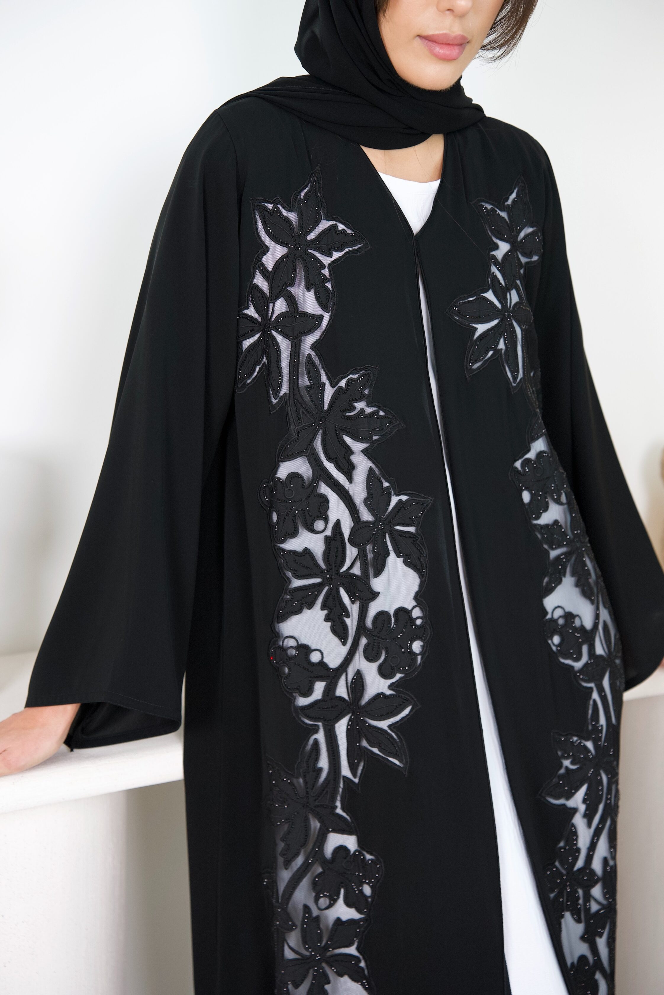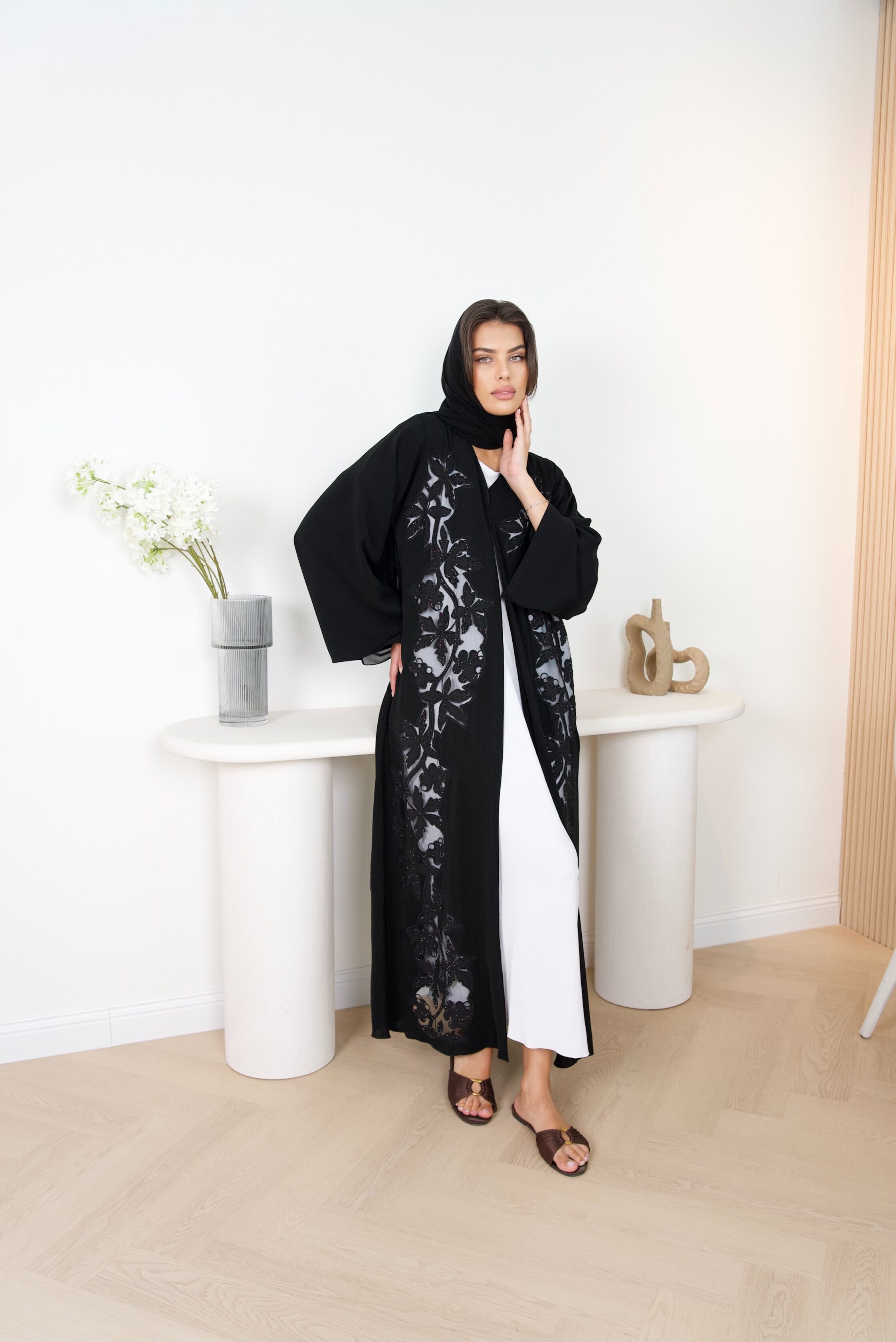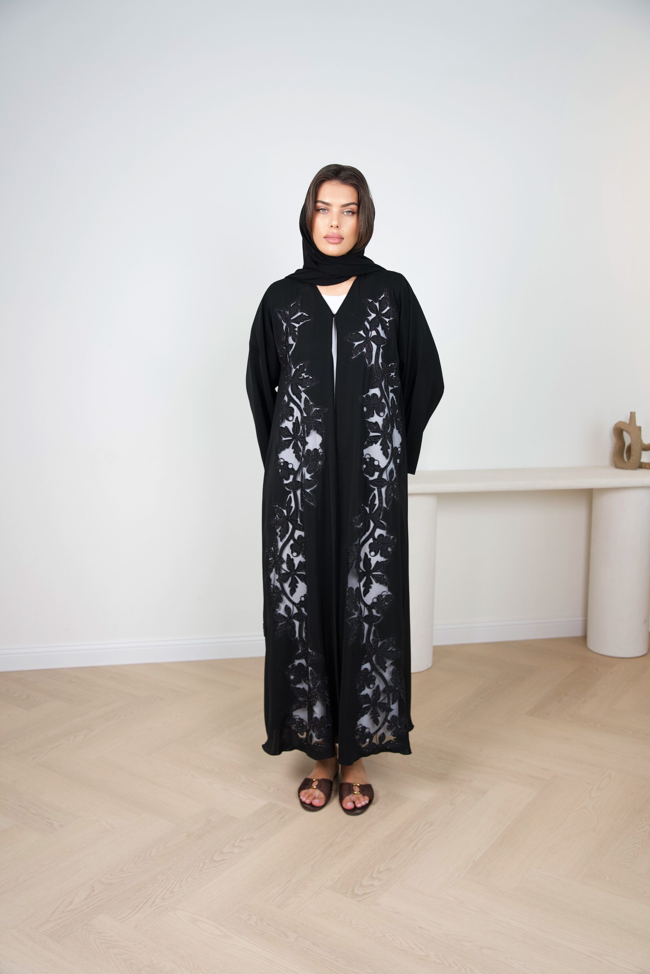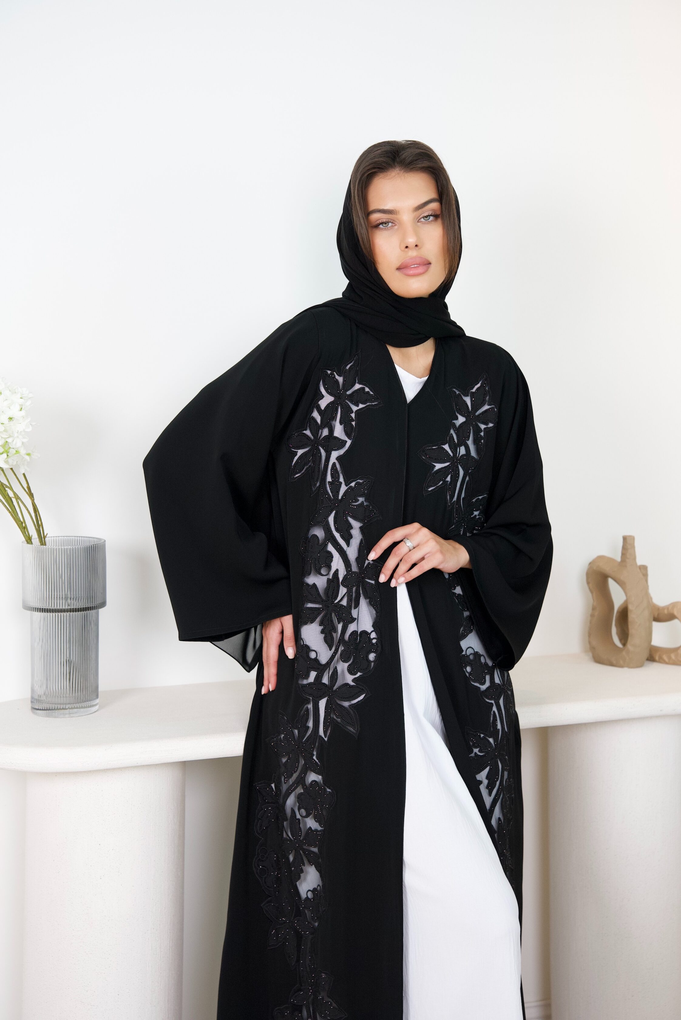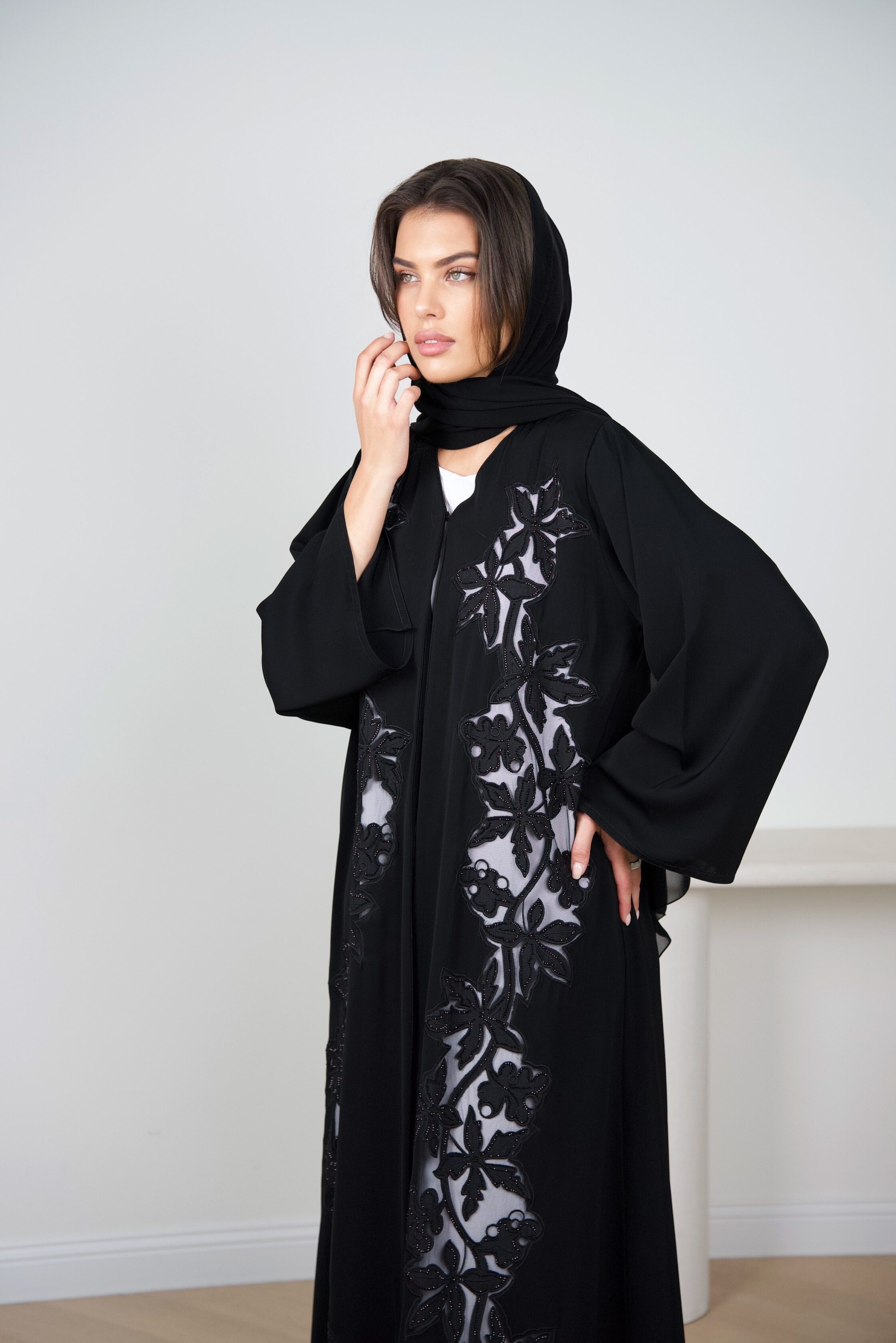 The Delicate Beadwork Dantel Black Abaya is a luxurious and feminine piece crafted from premium Nada fabric. Featuring all-over floral dantel with intricate beadwork and subtle rhinestones, this abaya exudes elegance and sophistication. Its flowing silhouette provides comfort while creating a graceful, refined look, making it perfect for weddings, formal events, and special occasions.