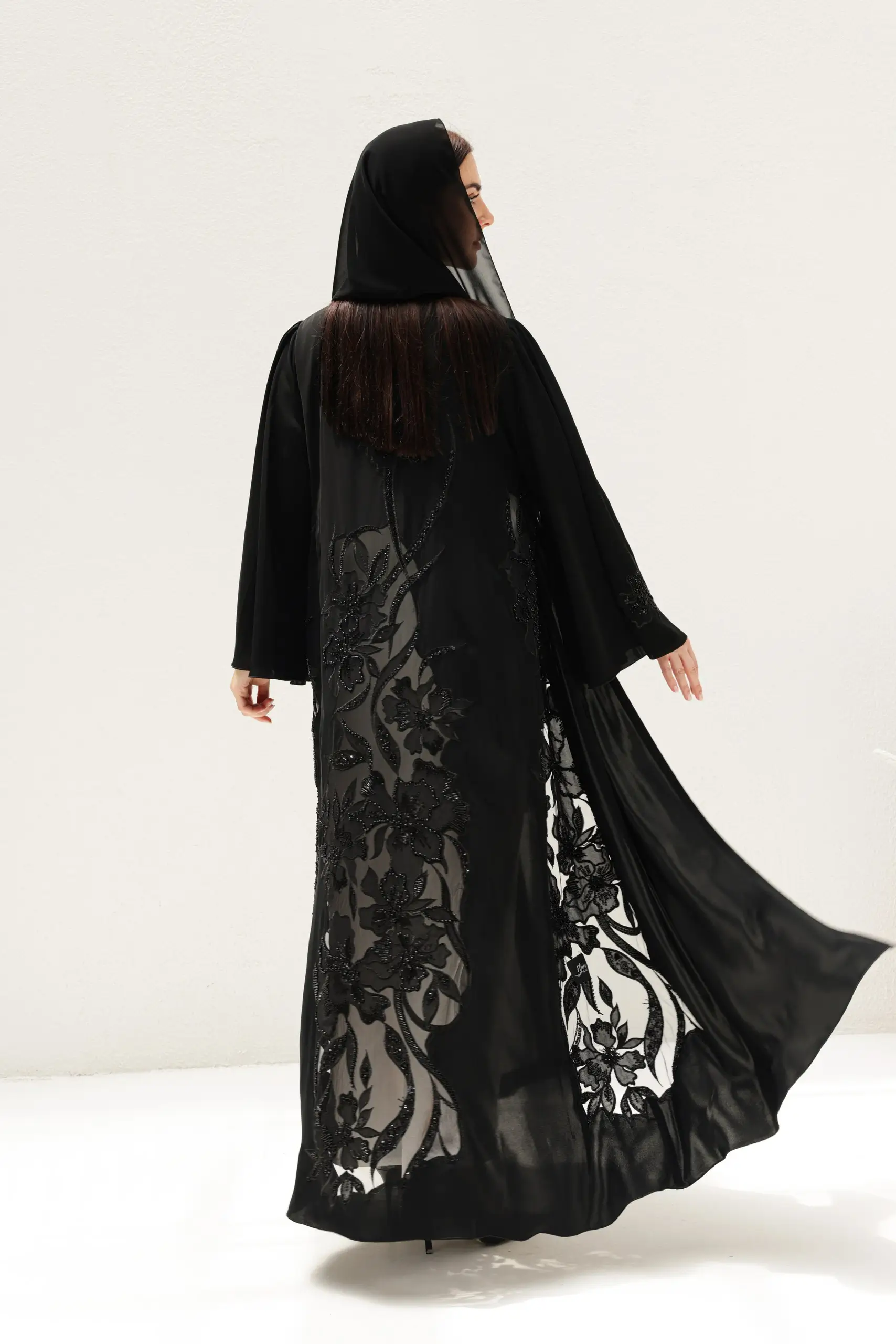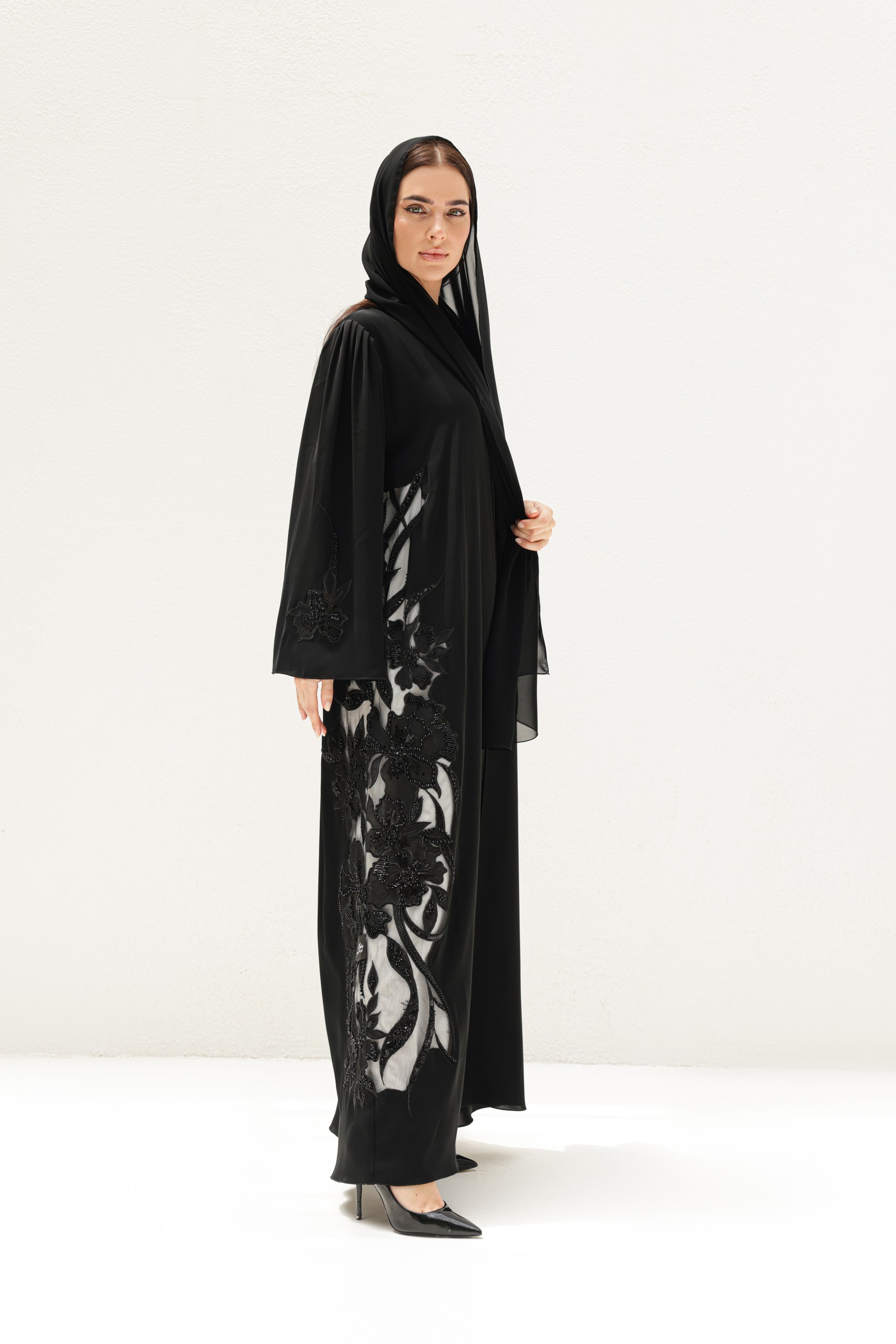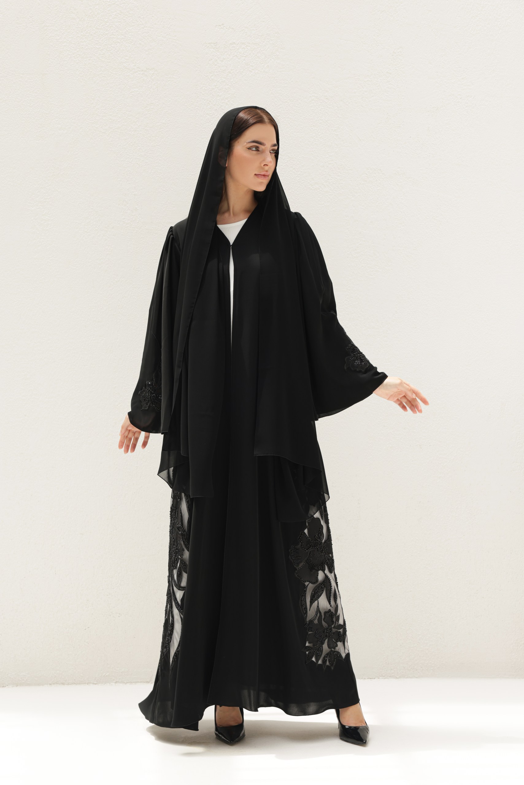 Our Haya abaya is crafted for women who value sophistication. Tailored with clear cuts, delicate high quality dantel that creates a look that is both traditional and modern. Comes with a Dujallail black shaila.