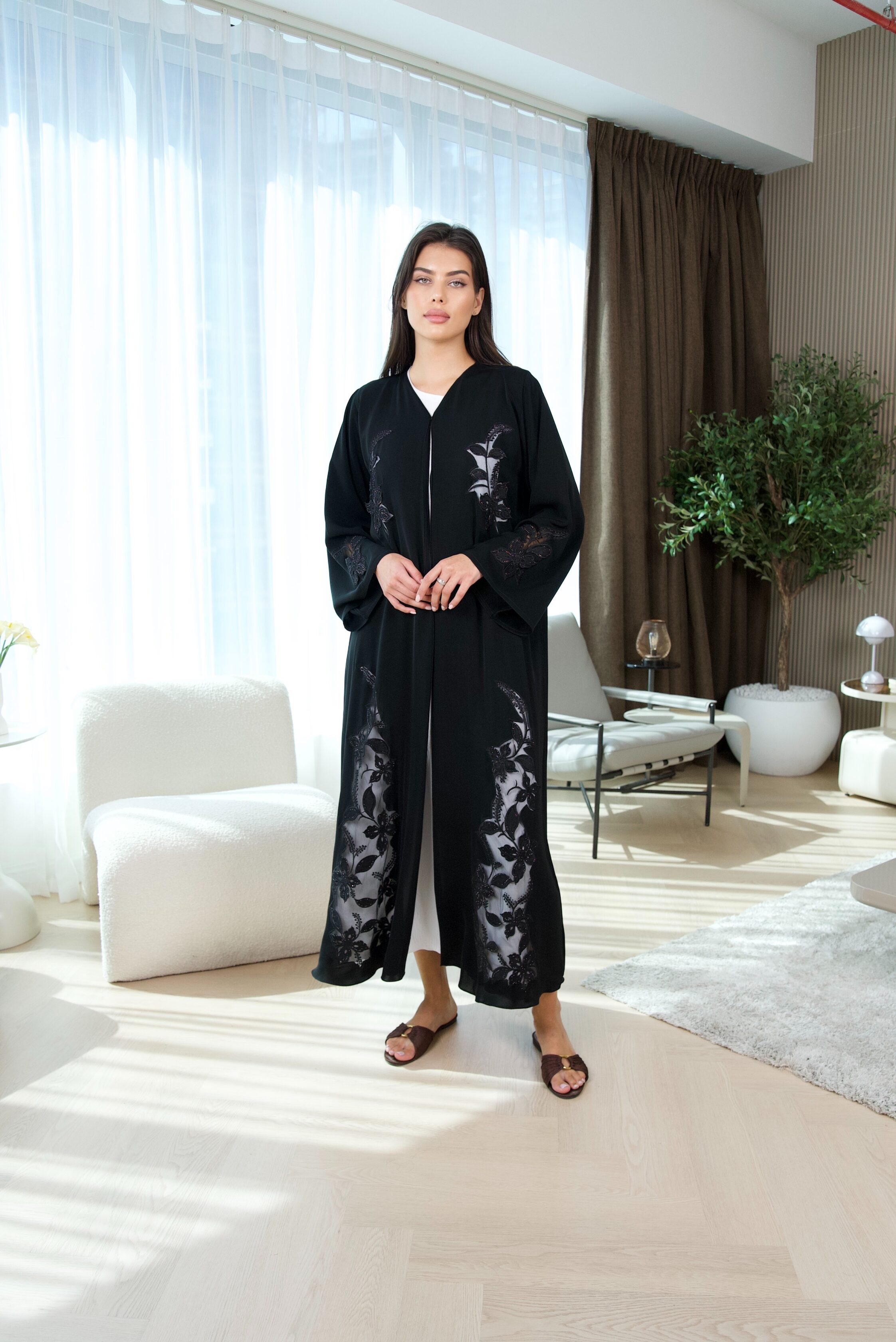 Elevate your evening wardrobe with the Layali Dantel Black Abaya, crafted from elite Nada fabric for a soft, luxurious feel. This abaya features exquisite all-over dantel work, delicately layered to create depth and a sophisticated texture. Paired with a matching black Dujallail sheila.
