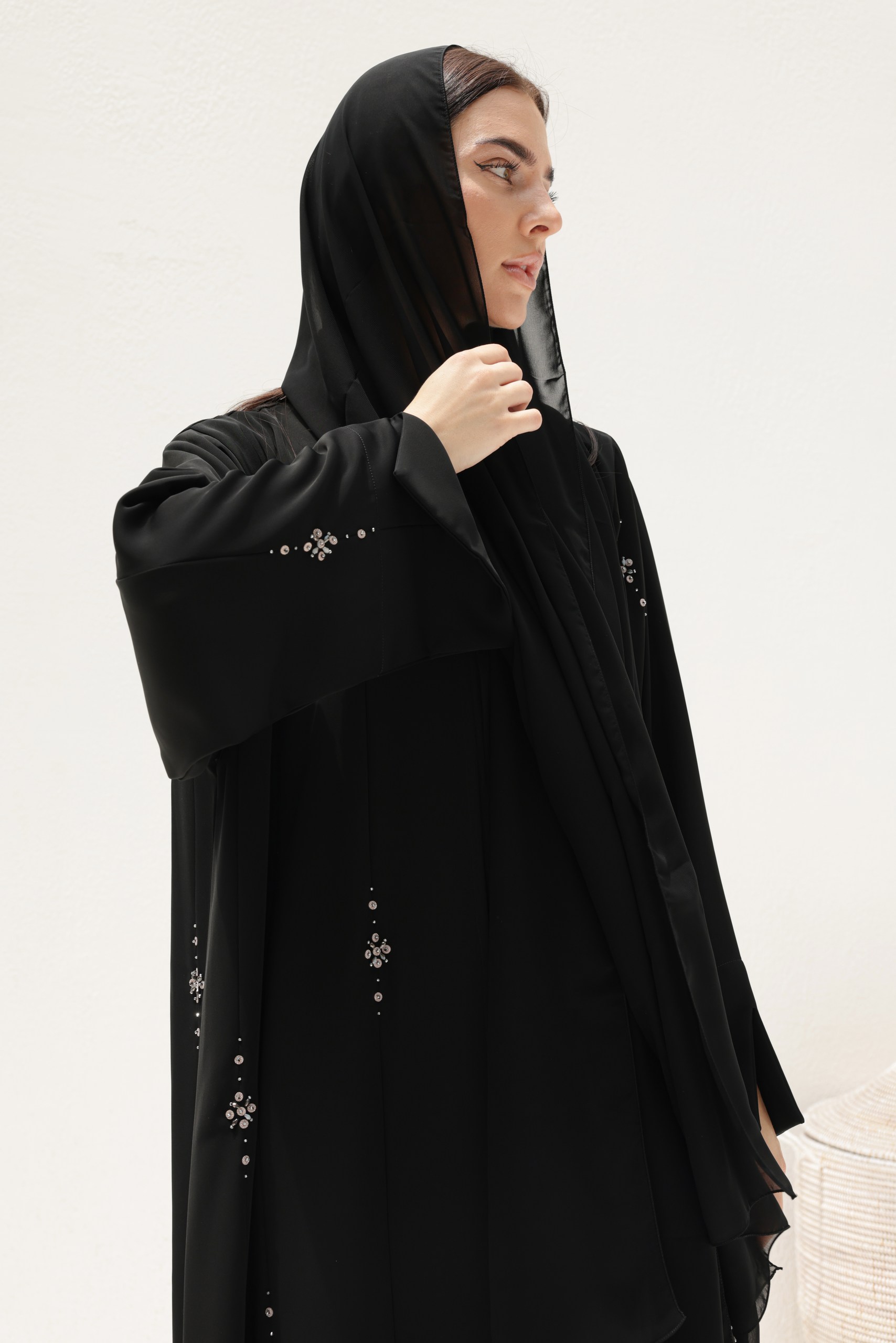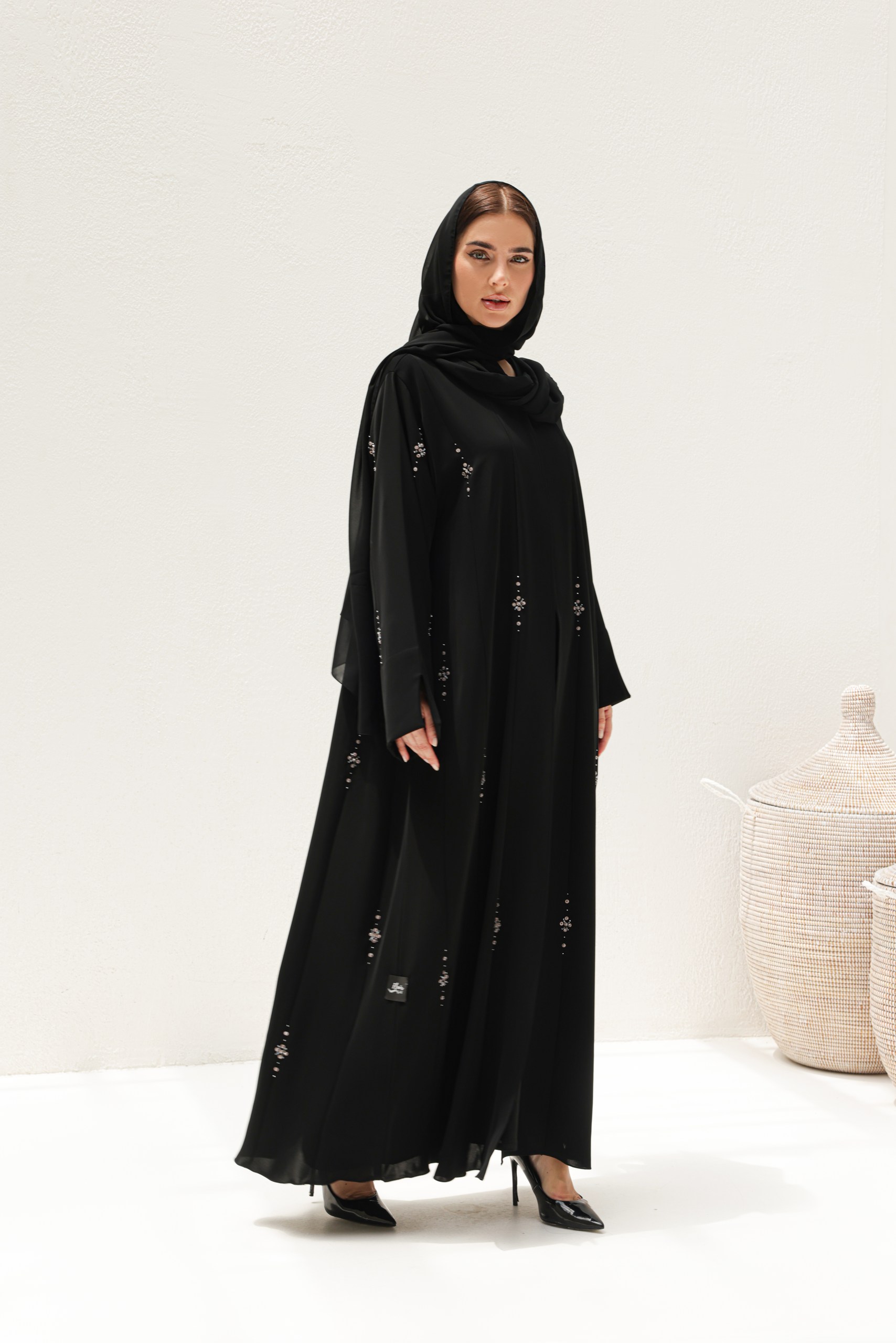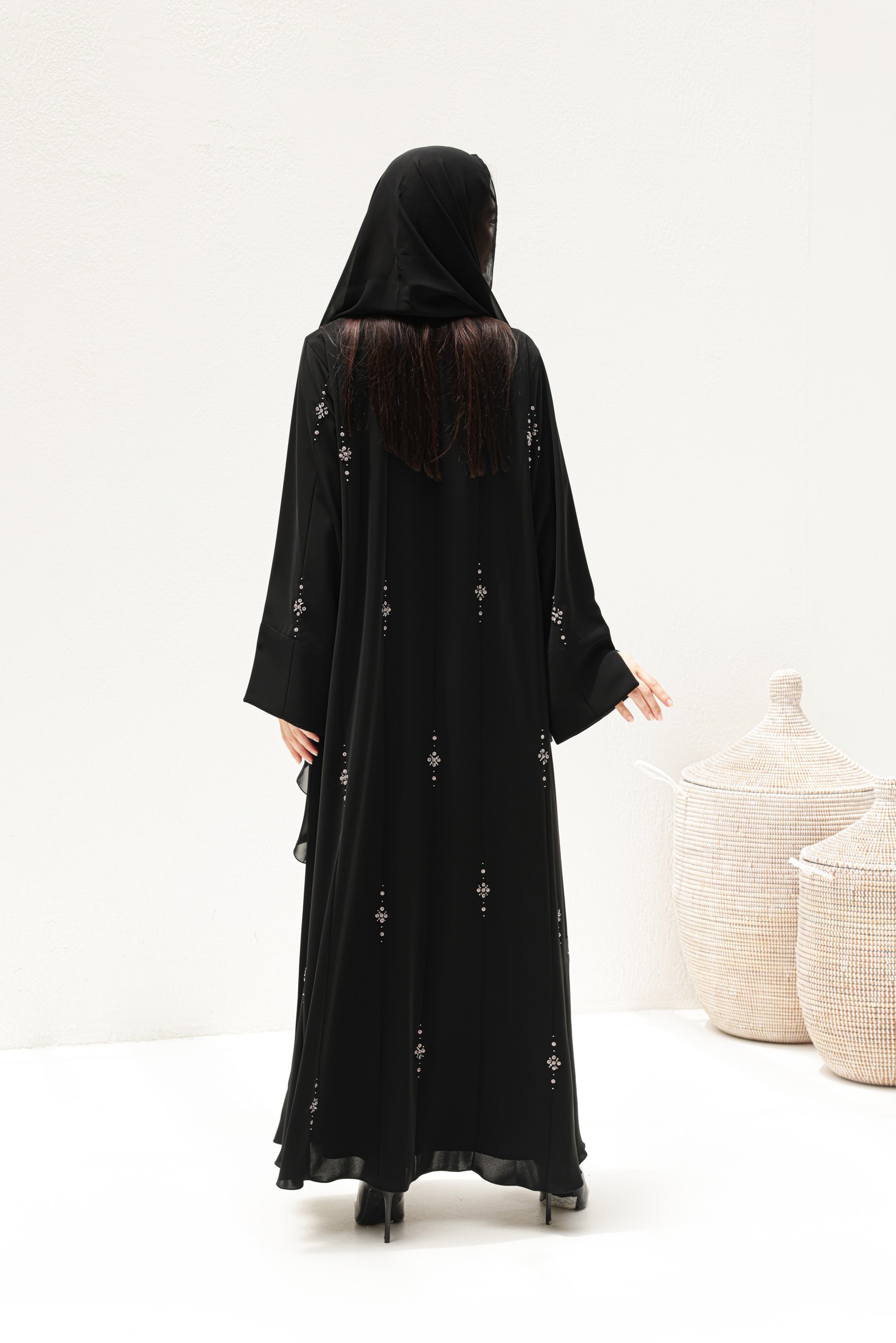 Draped in timeless black and adorned with shimmering silver rhinestones, this abaya captures the elegance of starlit skies. Designed with a flowing silhouette and graceful detailing, the Noor Al Layl Abaya is perfect for evening gatherings, special occasions, work day or whenever you want to shine with understated sophistication.