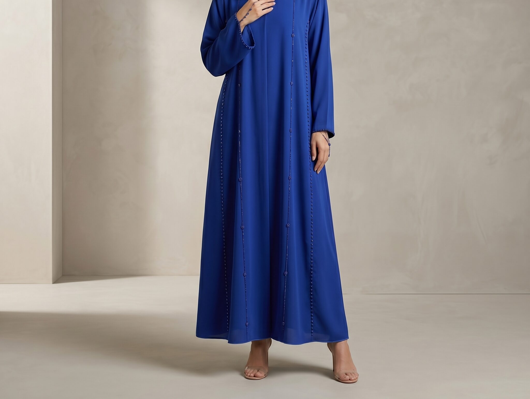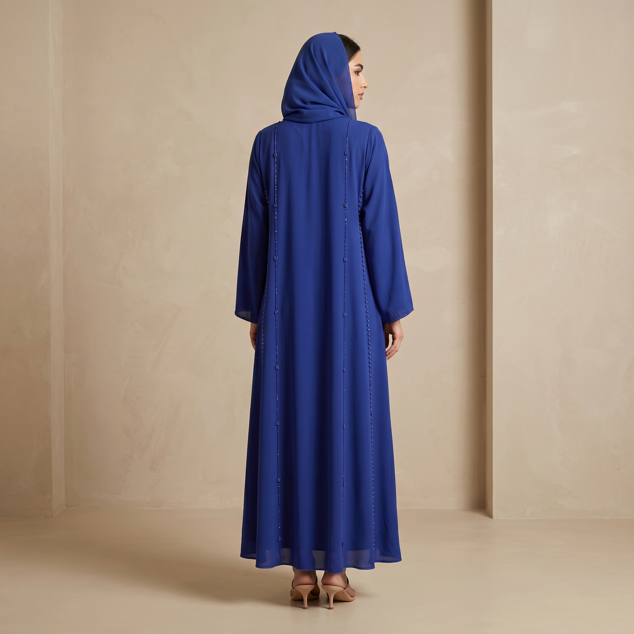 A Royal blue abaya crafted from premium, flowy Nada fabric, designed for effortless elegance. Finished with delicate handwork that adds a refined touch. Graceful in movement and striking in presence, it’s made to stand out.